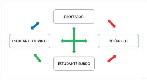 É um padrão em que ninguém assume a centralidade. São interações entre professor e estudantes surdos e ouvintes; entre estudantes surdos e estudantes ouvintes e interações entre intérpretes e estudantes ouvintes.
