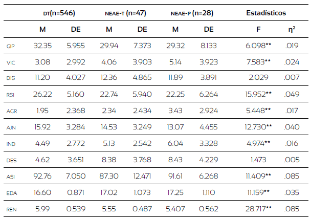 Los resultados consignados en la Tabla 1 permiten señalar que el grupo de estudiantes con NEAET y con NEAEP tienen una percepción más desfavorable que sus iguales clasificados como DT en aquellos aspectos relativos a su red social de iguales [Tukey p<.01], pero no hay diferencias significativas entre ellos. Del mismo modo, esa percepción es más desfavorable en la dimensión victimización, en la que el grupo de estudiantes con NEAEP obtiene una media de puntuación significativamente mayor que la de sus pares de DT [Tukey p<.01]. No se observan diferencias en las otras dos comparaciones.