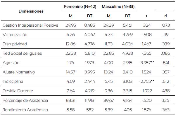 Como se puede observar de la Tabla 2, la percepción sobre la presencia de ocurrencia o participación en situaciones de agresión de los hombres es significativamente superior a la que tiene el grupo de las mujeres, con un tamaño del efecto grande. Del mismo modo, los hombres también se ven envueltos o perciben mayor ocurrencia de situaciones de indisciplina que la percibida por las mujeres, con un tamaño del efecto grande. No hay diferencias estadísticamente significativas en las otras dimensiones examinadas, con tamaños del efecto medios y pequeños.