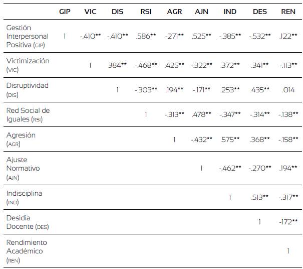 Los análisis de correlaciones muestran un respaldo a la validez de las dimensiones del constructo convivencia escolar; pues si la percepción de los estudiantes es favorable respecto de aquellos aspectos y situaciones ligadas a una adecuada gestión interpersonal positiva, un ajuste normativo y una buena red social de iguales, estos tienden a presentar un mejor rendimiento académico. De igual manera, una percepción más desfavorable, respecto de la presencia de situaciones de victimización, agresión, desidia docente e indisciplina, tienden a asociarse con peor rendimiento académico, lo que resulta coincidente con otras investigaciones nacionales e internacionales (De Pedro et al., 2016).