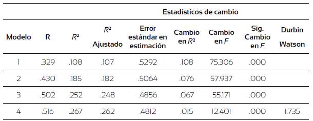 Para garantizar la validez del modelo, se analizó la independencia de los residuos. El estadístico D de Durbin-Watson obtuvo un valor D= 1.735, confirmando la ausencia de autocorrelación. Del mismo modo, se asumió la ausencia de colinealidad y, por lo tanto, la estabilidad de las estimaciones al obtener valores de tolerancia y factores de inflación de la varianza cercanos a 1.
