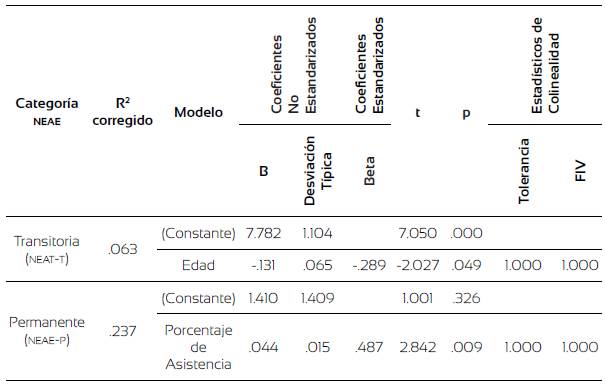 Del análisis de regresión para los estudiantes con NEAET y con NEAEP, estos modelos explican el 6,3% y 23,7%, respectivamente, de la variabilidad de las calificaciones de estos estudiantes. En el caso de los estudiantes con NEAET, la edad tiene un peso negativo (β = -.289), mientras que para el caso de los estudiantes con NEAEP, la asistencia a clases es la variable que tiene un peso relevante y de forma positiva (β = .487).
