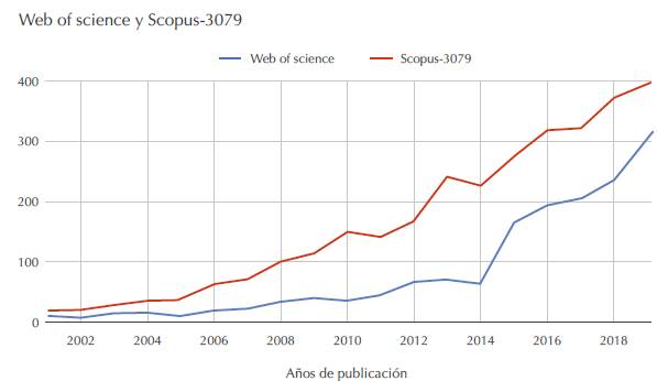 Figura 1: Crecimiento de Publicación del tema en dos bases de datos Web of Science y Scopus desde el año 2001 al año 2019.