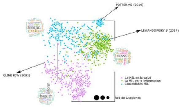 A importância do conceito de Literacia Mediática Informacional e Digital (MILD) em diferentes contextos sociais reside na capacidade crítica dos indivíduos e da sociedade em relação às fontes de informação com as quais interagem no seu quotidiano. Apesar de sua relevância, há produção académica limitada relacionada às abordagens e aplicações atuais e às perspectivas futuras. Este artigo relata a revisão da literatura sobre MILD considerando o fator mencionado acima. No total, 370 estudos publicados entre 2001 e 2019 nas bases de dados Web of Science e Scopus foram envolvidos no estudo e o algoritmo Tree of Science (ToS) foi posteriormente aplicado para identificar a literatura mais relevante sobre o assunto. Os resultados mostraram que o conceito MILD apresenta trés perspectivas: o conceito MILD e sua utilização no setor saúde, a notícia com seus efeitos na sociedade e a alfabetização como ferramenta de validação da informação. Na análise das redes, nos diferentes componentes da árvore, destacam-se 10 trabalhos para cada perspectiva que permitiram consolidar a discussão.