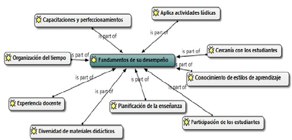 A partir del análisis de los datos procesados con el programa Atlas ti, los resultados se organizaron en tres categorías con sus correspondientes subcategorías: Categoría 1: Fundamentos del desempeño y satisfacción y las subcategorías emanadas del análisis son: 1) capacitaciones y perfeccionamientos; 2) aplicación de actividades lúdicas; 3) cercanía con los estudiantes; 4) conocimientos de estilos de aprendizaje; 5) participación de estudiantes; 6) planificación de la enseñanza; 7) diversidad de materiales didácticos; 8) experiencia docente y 9) organización del tiempo.