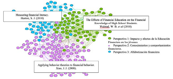 Del análisis de red y por medio de la revisión bibliométrica se logran identificar tres perspectivas de investigación relacionadas con el tema de Educación Financiera en la población joven. La primera de ellas denominada Impacto y efectos de la Educación Financiera en los jóvenes, se enfoca en los resultados de programas de Educación Financiera con énfasis en políticas obligatorias de Educación Financiera en las escuelas.