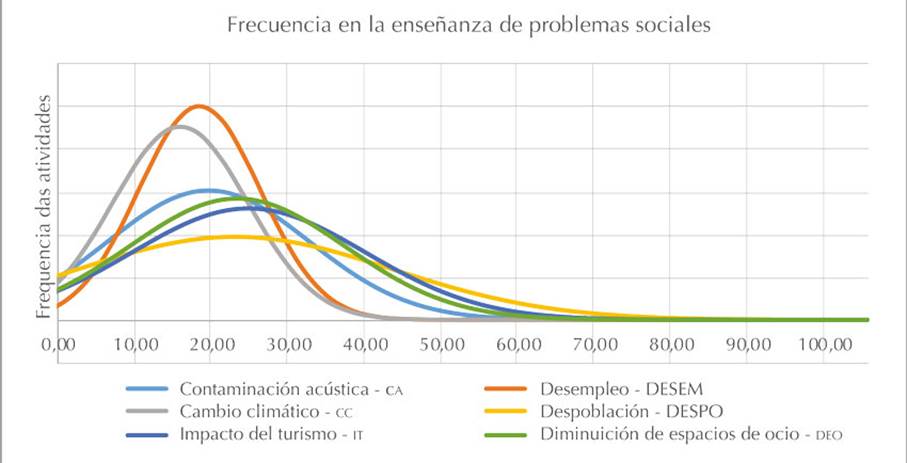 A partir de la tabla 3 se han considerado los análisis de frecuencia por distribución normal de probabilidad, que se representan en la figura 1. Las curvas más acentuadas hacen referencia al desempleo y al cambio climático, lo cual indica que el profesorado ha sido más uniforme en el tratamiento didáctico de esas temáticas. Las curvas que representan el impacto del turismo y la contaminación acústica presentan una mayor variabilidad en las respuestas, de entre la totalidad de la muestra seleccionada en el estudio. Se trata de actividades que fueron más trabajadas por el profesorado, pese a que existe una mayor variabilidad en su frecuencia.