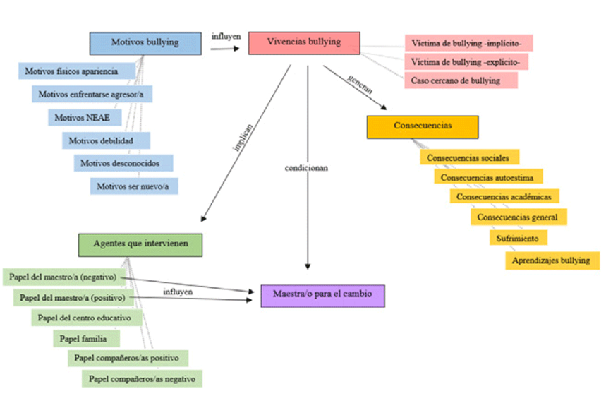 El análisis de este código “Maestro/a para el cambio” es clave en este trabajo. La comprensión de la elección del título por haber sido víctima o testigo del acoso escolar se sustenta fundamentalmente en el sufrimiento vivido y en el papel que desempeñaron los docentes en sus vivencias (figura 2). De los diecisiete alumnos que experimentaron esta situación, diez mencionan directamente la idea de ser maestro para formar parte del cambio -el resto lo hace de forma indirecta- en línea con la investigación de Berbel (2017) . Emerge de sus discursos la importancia de tomar un papel activo, de acabar con este tipo de situaciones, de crear vínculos con el alumnado, de formarse sobre esta temática y de trabajar valores positivos en el aula cuando desempeñen su profesión (empatía, respeto, inclusión e igualdad, entre otros): “De hecho, hacerme maestro significa para mí darle seguridad a aquellos niños y niñas que pueden llegar a sufrir lo que yo he sufrido y enseñarles que todos somos iguales sin fijarnos en las apariencias” (D65.3.O). Se pone en valor la figura de los maestros que los apoyaron en esas situaciones y que tienen como referentes del cambio: “Esa fue otra de mis motivaciones para llegar hasta aquí, poder ayudar en un futuro a mis alumnos u otros niños que sufran lo que sufrí yo del modo en que esos dos maestros me ayudaron a mí” (D82.4.A). A partir de esas vivencias han forjado la imagen del docente que quieren ser, distanciándose del profesorado que prefirió no enfrentar la realidad, algo que sucede con frecuencia (Dilo todo contra el bullying, 2021; Rodrigo, 2019).
