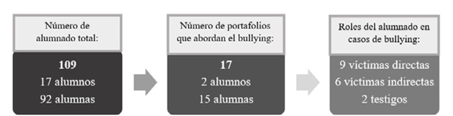 El análisis de los portafolios electrónicos del alumnado pone de relieve la importancia que el acoso escolar tiene en la vida de las personas y en sus trayectorias profesionales. Cabe recordar que en ningún momento se preguntaba si habían sido víctimas o habían presenciado casos de acoso escolar, por lo que los relatos emergen de forma espontánea al recordar su paso por la escolarización obligatoria, lo que añade incluso una mayor fuerza al análisis, por la huella que dejó en el alumnado (figura 1).