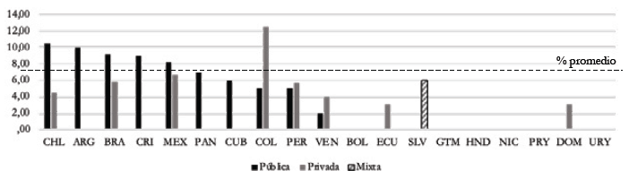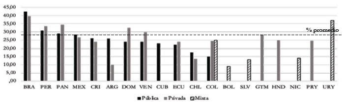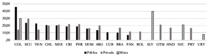 Es importante destacar que, de los resultados anteriores, las prácticas pedagógicas corresponden al 31 % del 42 % de las asignaturas de formación específica (como se señaló). Como se puede apreciar, la organización de las mallas curriculares de la titulación de EAPI en ALyC presenta importantes diferencias. A continuación, se ofrecen los resultados del análisis de los datos. En función de los elementos más relevantes, hemos representado los datos en gráficas para poder comparar los valores entre países y entre tipos de institución: pública, privada o mixta (combinada).