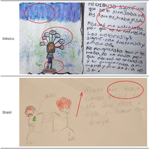 La mayoría de los estudiantes presentaron estabilidad emocional en relación con las estructuras de sus familias y su estabilidad. Por otro lado, en algunos dibujos de Perú y México se encontraron contenidos de ansiedad, obsesión, estrés y depresión, y estos significados también se relacionan con el confinamiento, junto con algunas expresiones (pocas) que muestran algún rasgo de depresión o ansiedad. En cuanto a la edad, existen diferencias en los rasgos de las patologías encontradas, aunque solo se han notado claramente en los participantes entre los diez a los doce años. Estos se diferencian en la muestra de dibujos de Brasil y Perú con respecto a México. En los dibujos de este último país, es más clara la presencia del estrés que en Brasil y en Perú. No obstante, en los niños menores de 10 años, las diferencias fueron mínimas.