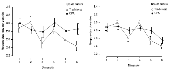 Considerando las respuestas de los participantes, se creó una nueva variable llamada tipo de cultura, codificando los datos conforme a si cada respuesta se identificaba con una práctica vinculada a una cultura tradicional o a una CPA. Luego se construyeron dos gráficas para comparar las tendencias considerando los valores promedio de cada dimensión y el cargo ocupado en el centro educativo (figura 2).