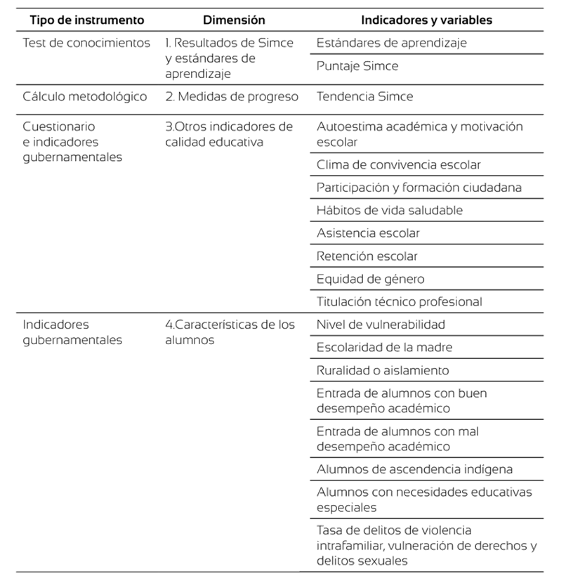 El Simce es una evaluación nacional aplicada en diferentes periodos de la etapa escolar obligatoria, de carácter censal y muestral que pretende medir el logro de los contenidos y habilidades en diversas materias y áreas de aprendizaje. Integra además los “Cuestionarios de calidad y contexto”, que son contestados por el alumnado, el profesorado, las familias y apoderados, y que buscan información de los siguientes indicadores y variables (tabla 1).
