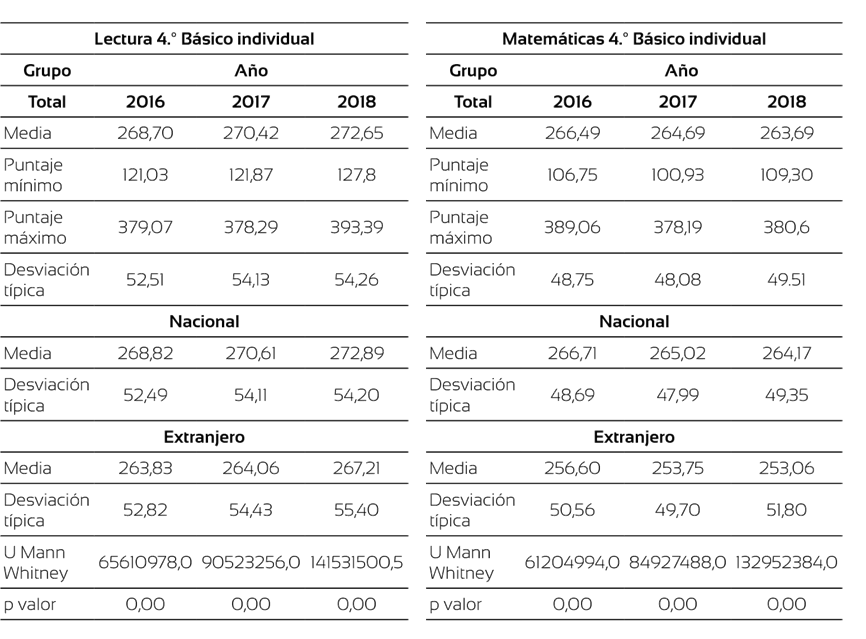 Respecto a este primer nivel, se observan diferencias estadísticamente significativas en las medias de los puntajes del alumnado nacional y extranjero (tabla 4), tanto en lectura como en matemáticas. La variación de los puntajes entre ambos grupos en cada año es muy similar, con aumento aproximadamente de dos puntos a lo largo de los años. En el caso