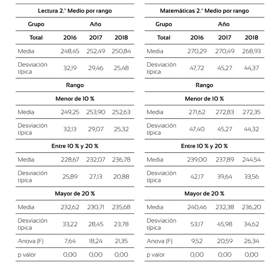 En el caso de 2.º Medio (tabla 7), existe una diferencia de hasta 17 puntos entre las escuelas con menor y mayor presencia de alumnado extranjero. En la prueba de matemáticas y lecturas las diferencias son estadísticamente significativas, con hasta 36 puntos de diferencia entre el primer y último grupo