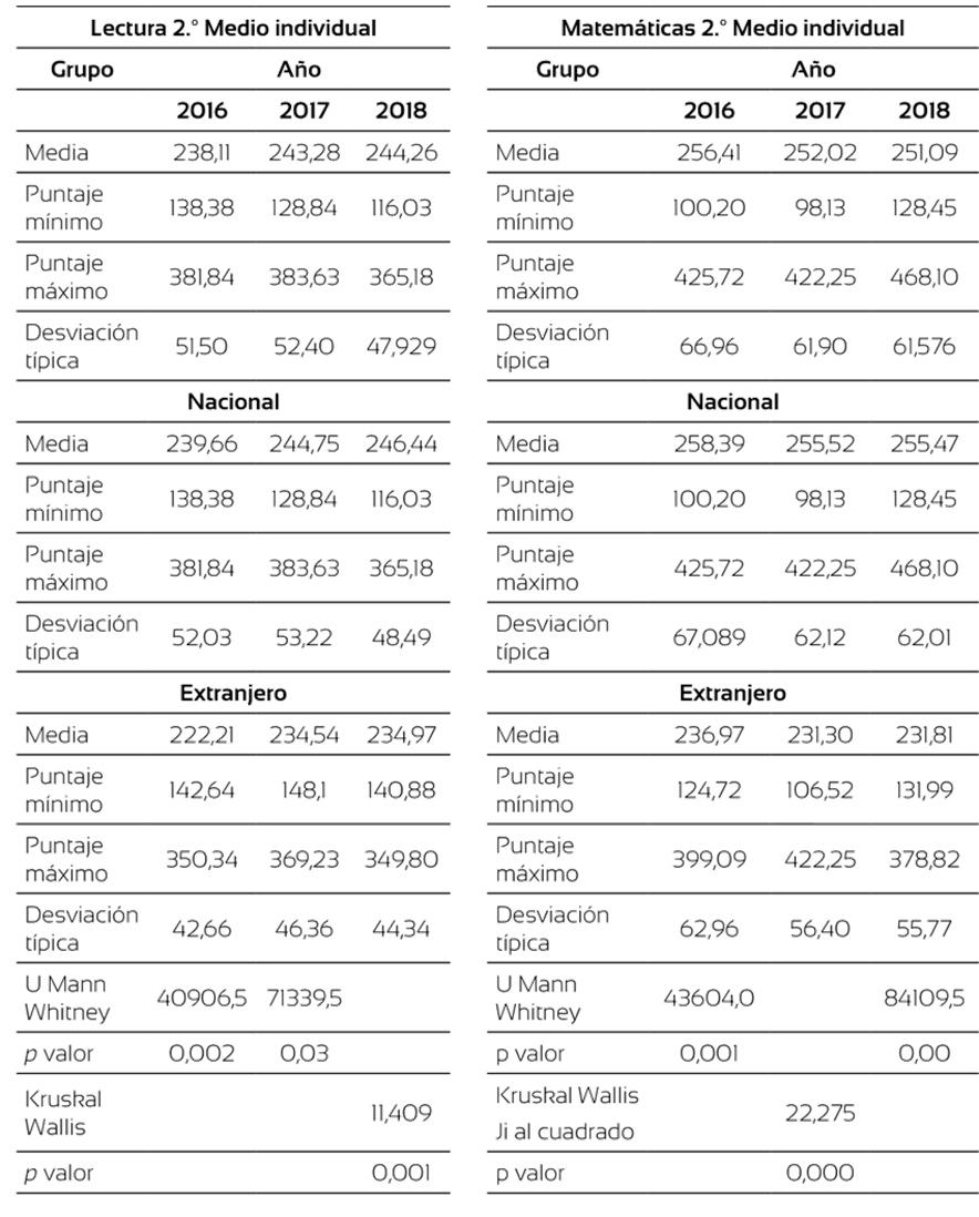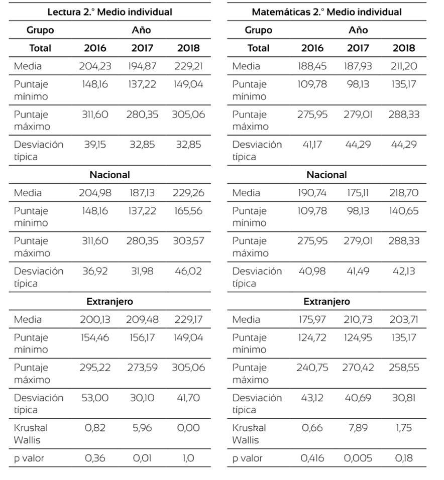 En el caso de 2.º Medio (tabla 13), tanto en lectura como en matemáticas, los resultados de ambos grupos muestran diferencias estadística- mente significativas el año 2017 (tabla 12), cuando el alumnado extranjero obtiene 36 y 23 puntos más en matemáticas y lectura, respectivamente. Junto con esto, es posible observar que para los años 2016 y 2018 las diferencias no son estadísticamente significativas; ya que el alumnado nacional alcanza la puntuación más alta los años 2016 y 2018.