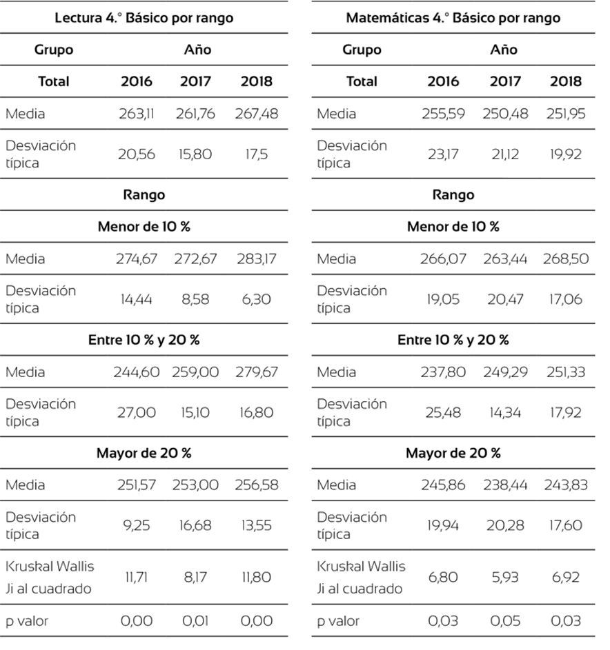 En la tabla 4 se observa algo similar, aunque identificamos un fenómeno diferente en el grupo de 4.º Básico. Las diferencias de puntajes entre los grupos son mayores, siendo para lectura de 10 puntos y de 20 puntos, aproximadamente, en la prueba de matemáticas, además vemos bajas de puntaje en ambos en la prueba de matemáticas y alza en el puntaje entre los mismos años en la de lectura.