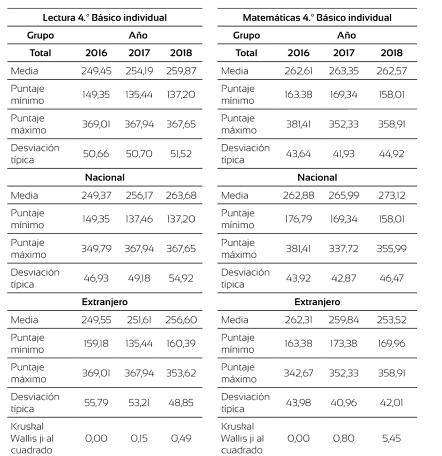 The academic results of foreign students have been the subject of study in recent years. In this sense, we can find various investigations that have shown that the reasons that lead foreign students to obtain lower results, compared to their native peers, are much more complex than merely socioeconomic level. An investigation is presented that had the purpose of describing and analyzing the results obtained by foreign students on Chi le’s Simce mathematics and reading test for 4th and 2nd graders, during the years 2016, 2017 and 2018, across three levels: regional, communal and school-specific. A quantita tive analysis was carried out using secondary data from the metropolitan region of Chile, as it is the region with the highest percentage of foreign students incorporated in recent years. The study specifically compare similar contexts, considering that socioeconomic variables are one of the main explanations for the gaps in results. Among the main fin dings, it was noted that in the Chilean case, the school takes on great relevance, since no statistically significant differences are observed between foreign and national students within these settings. This observation challenges thediscourses installed under the gaze of global analyses, highlighting the potential misinterpretation of data when examined at macro levels such as a country or a region. Considering the ethical relevance of working with school student results, the study employed anonymized data to ensure criteria of good practices and reserach ethics.