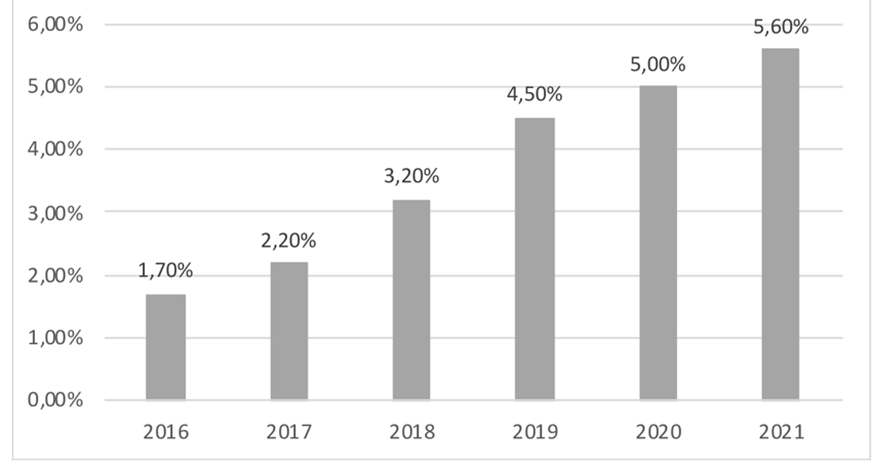 Figura 1: Porcentaje de alumnos/as extranjeros/as en Chile (2016-2021)