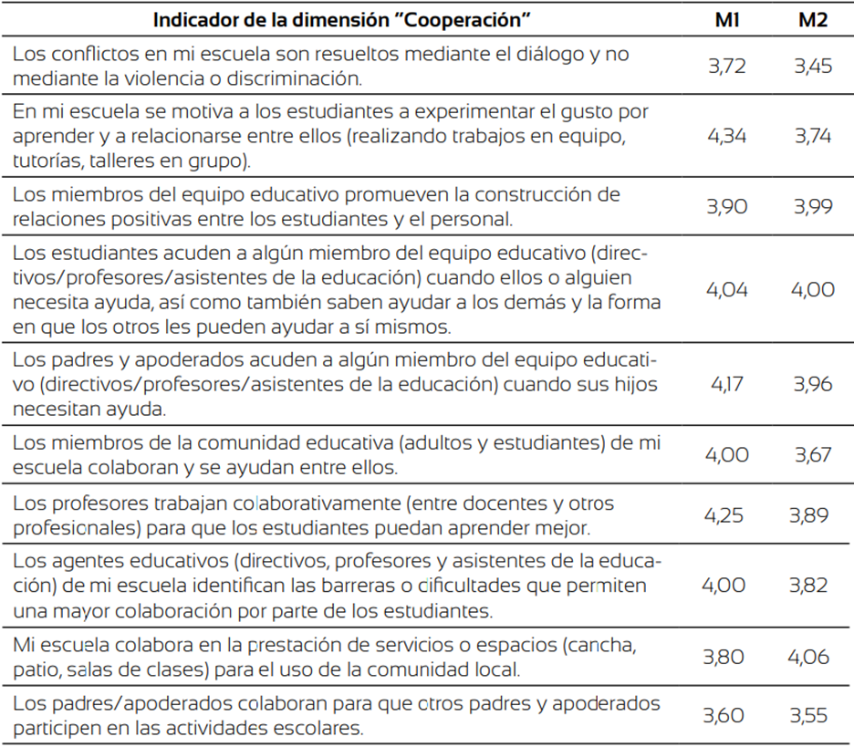 Cooperación (10 ítems). Cuantifica percepciones que tienen los agentes educativos respecto a si justamente fomentan la cooperación, entendiendo la visión inclusiva de comunidad ligada a un sentimiento de solidaridad y reciprocidad. Considera afirmaciones del tipo “Los miembros de la comunidad educativa (adultos y estudiantes) de mi escuela colaboran y se ayudan entre ellos”.