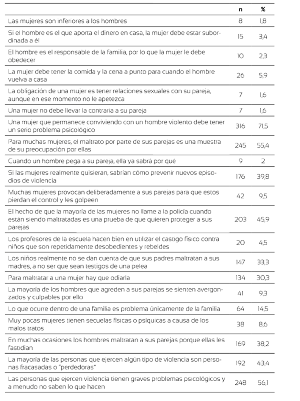 La tabla 1 recoge el porcentaje respecto a los pensamientos distorsionados sobre las mujeres y el uso de la violencia. Los mayores porcentajes se encuentran en afirmaciones relacionadas con la existencia de problemas psicológicos en la víctima o en el agresor, así como la consideración de que la violencia es una muestra de la preocupación del hombre por la mujer.