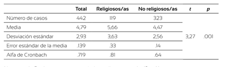 Como se indica en la tabla 3, el número promedio de distorsiones cognitivas sobre los roles tradicionales y la violencia de género es de 4,79 (DT = 2,93). La escala muestra una fiabilidad aceptable tanto para personas religiosas como no religiosas. Además, presentan puntuaciones superiores quienes se consideraban religiosas (M religiosas = 5,66; DT = 3,63 vs. M no religiosas = 4,47; DT = 2,56).