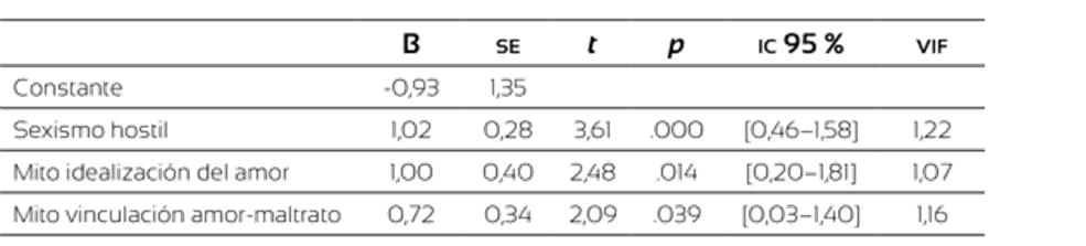 Los análisis de regresión lineal y los path analisis (structural equation modeling (SEM) corroboran las diferencias entre quienes profesan una religión y quienes no. En la muestra de personas religiosas, el modelo compuesto por el sexismo hostil, el mito idealización del amor y el mito vinculación amor-maltrato parece predecir el 25 % de la varianza de los pensamientos distorsionados sobre la violencia de género, y mostrar unos índices de ajuste adecuados (c2/gl > 3; GFI, AGFI y CFI > .90; Standardized RMR < .08). En el caso de las personas no religiosas, el análisis de regresión parece explicar el 12,8 % de la varianza, excluyendo los mitos del amor romántico e incorporando a la ecuación tanto el sexismo hostil como el benévolo. Estos datos señalan las diferencias en función de la religiosidad e inciden en que la transmisión de valores patriarcales (Vaamonde y Omar, 2012), la subordinación social de la mujer (Cárdenas et al., 2010) y la discriminación hacia esta, aún disfrazada de amor, suponen un riesgo en la erradicación de la violencia de género.