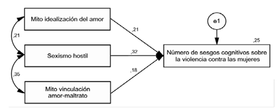 Se han efectuado dos análisis de regresión lineal múltiple (método por pasos) para predecir las creencias distorsionadas sobre la mujer y el uso de la violencia, uno con la muestra de personas religiosas y otro con las no religiosas. La variable dependiente fue la puntuación obtenida en el IPDMUV-R y las variables predictoras fueron: sexismo hostil, sexismo benévolo, mito idealización del amor y mito vinculación amor-maltrato. Como se muestra en la tabla 5, en las personas religiosas, los pensamientos distorsionados se pueden predecir a partir del sexismo hostil, del mito idealización del amor y del mito vinculación amor-maltrato (coeficiente de regresión = .51; Anova, F = 13,77, p = .000). La idoneidad del modelo de medida se calculó con metodología SEM, y el método de estimación de máxima verosimilitud (ML). El modelo predice el 25 % de la varianza del número de sesgos cognitivos y los coeficientes estimados son significativos (figura 1). Los estadísticos de bondad de ajuste reportan un ajuste adecuado del modelo de predicción (χ2= 2,23; gl = 1; p = .135; χ2/gl = 2,23; GFI = .99; AGFI = .90; CFI = .97; SRMR = .05). En síntesis, los pensamientos distorsionados sobre la violencia de género reciben un efecto significativo del mito idealización del amor (β = .21, p < .05), del sexismo hostil (β= .32, p < .05) y del mito vinculación amor-maltrato (β= .18, p < .05).