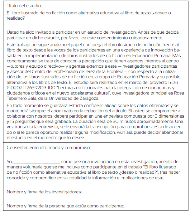 No ambiente escolar existe um amplo debate sobre a relevância do livro de texto como principal material didático. Consequentemente, alternativas muito diversas têm sido exploradas que buscam melhorar o processo de ensino-aprendizagem. No entanto, o escasso lugar que o livro ilustrado de não ficção tem ocupado neste debate coloca-nos diante da necessidade de analisar o papel que este tipo de livro desempenha face ao livro de texto. Por isso, foi realizada uma pesquisa etnográfica participativa por meio de entrevistas semiestruturadas com diferentes sujeitos envolvidos em uma experiência de inovação baseada na implementação de livros ilustrados de não ficção, nas salas de aula da Educação Primária de um centro educacional de Cádiz. A informação obtida foi processada por meio do programa de análise qualitativa nvivo-12 e ficou evidenciado que os participantes encontram mais benefícios em livros ilustrados de não ficção do que em livros de texto, posicionando-se a favor de utilizá-los como alternativa para melhorar o desempenho acadêmico estudantil. No entanto, este é pensado como uma realidade utópica ao detectar dificuldades associadas à falta de formação e de recursos económicos. Por fim, conclui-se que esses livros devem ser gradualmente introduzidos nos centros educacionais como complemento aos livros de texto para modificar a cultura profissional com o apoio de programas institucionais.