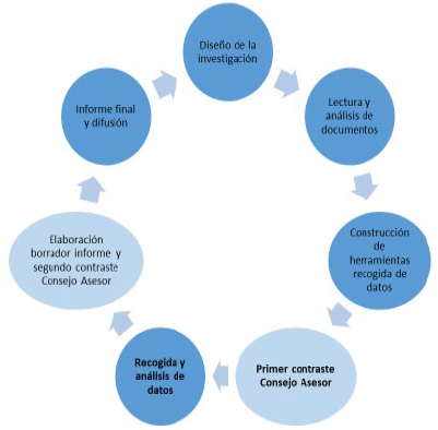 Como se ha mencionado anteriormente, la metodología que se desarrolla en la investigación ha sido la comunicativa, y dentro de ella, se ha constituido una estructura organizativa consultiva y de contraste denominado Consejo Asesor. La función de este ha sido aportar un contraste a algunos pasos dados a lo largo del proceso, lo cual nos ha permitido recoger información relevante acerca de la significatividad y adecuación de las propuestas realizadas y avances hechos. Un total de ocho personas que trabajan actualmente en el desarrollo integral del alumnado con sordera constituyen dicho Consejo Asesor: personas con sordera que puedan hablar de su experiencia en primera persona, familias de estas y diferentes profesionales que trabajan con estas en el ámbito educativo y logopédico. Como puede observarse en la figura 1, se han efectuado dos contrastes con ese Consejo Asesor a lo largo del proceso de investigación.