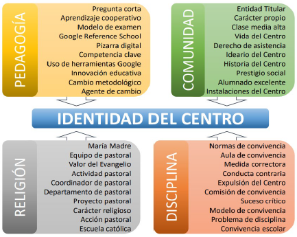 La definición tanto de la macrocategoría como de las categorías y dimensiones de análisis obedece a un proceso doble, que parte de una definición apriorística basada en una primera lectura y en los referentes teóricos, y que a la luz de los resultados del análisis lexicométrico se confirma, matiza o refuta. En términos generales, las memorias de prácticas revelan la existencia de un discurso institucional compartido por los centros educativos católicos, el cual utiliza una arquitectura textual persuasiva con adjetivos y sustantivos que ensalzan sus bondades. Este discurso define la identidad del centro educativo por oposición a otro tipo de centros, y se despliega no solo en las memorias de prácticas, sino que también es confirmado por lo que aparece en las webs de los centros, a las que a menudo aquellas se refieren. Esta información está dirigida especialmente a las familias-clientes y, en algunos casos, aparece en folletos informativos y formularios de matriculación.