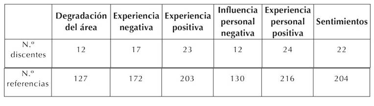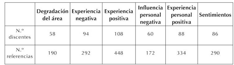 Podemos ver en el grupo maes que, aunque el alumnado aborda todos estos temas con homogeneidad en sus historias de vida, las menciones a la experiencia positiva y, especialmente, a la influencia personal positiva son más frecuentes que las referencias a la experiencia negativa, la influencia personal negativa y la degradación del área. También destaca un número significativo de referencias a los sentimientos.