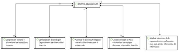 Modelo aditivo-jerarquizado: este modelo se caracteriza por una estructura jerárquica en la que los PES son personal externo al centro, sometidos a las decisiones educativas y organizativas de los PTE, y cuyas actividades se añaden a la oferta escolar existente.