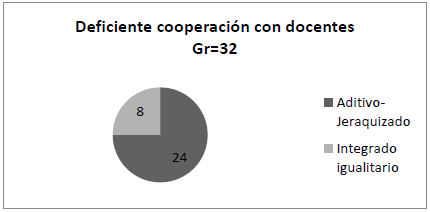El código “Deficiente cooperación con docentes” es mayor en el Equipo A-J y menor en el caso de Equipo I-I. Esto sugiere que los problemas son más frecuentes o la cooperación es más deficitaria en el primero. No obstante, existe otro código relacionado con una cooperación problemática que está mucho más presente en el caso del Equipo I-I.