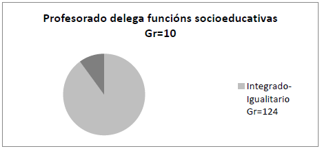 El código “Profesorado delega funciones socioeducativas” alude a un problema concreto: los docentes no asumen plenamente sus funciones socioeducativas en la escuela. Este problema es más frecuente en el Equipo I-I, donde la cooperación problemática se relaciona con la praxis, es decir, con la puesta en práctica de las funciones profesionales de los educadores sociales en la escuela y su colaboración con los equipos docentes, lo que se manifiesta en las tensiones derivadas de la distribución de tareas.