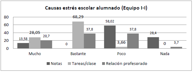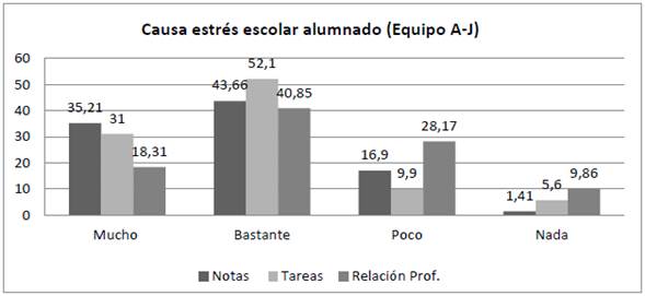 El alumnado del Equipo A-J manifiesta sentir estrés debido a las notas, las tareas escolares y la relación con el profesorado, actividades que se relacionan principalmente con las funciones profesionales de los equipos docentes.