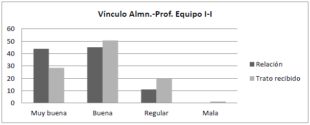 En el Equipo I-I, los resultados son similares; la mayoría del alumnado valora positivamente tanto la relación con el profesorado como el trato recibido, calificándolos como buenos o muy buenos, aunque, de nuevo, el trato recibido tiende a recibir valoraciones ligeramente más negativas en comparación con la relación general. Sin embargo, las valoraciones negativas son comparativamente menores que en la figura anterior.
