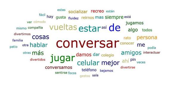 En la Figura 1 se observan las palabras que más se repiten en las respuestas de las y los estudiantes respecto a los focos de atención durante sus encuentros en el recreo. Entre ellas destacan: conversar, jugar, vueltas, estar, celular, hablar, entre otras.