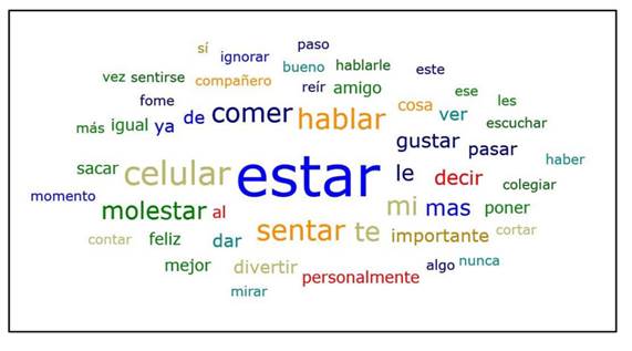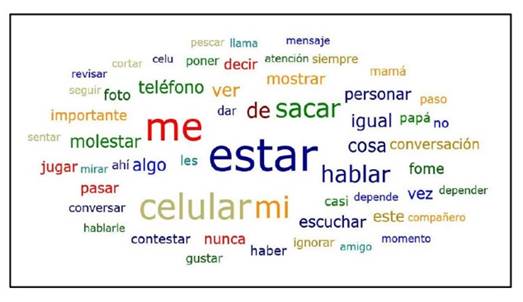 En la Figura 7 se puede observar la nube de palabras que evidencia los aspectos que se repiten con mayor frecuencia dentro de esta categoría, entre ellos: estar, me, celular, mi, hablar, sacar, mostrar.