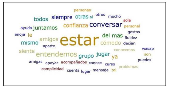 La solidaridad grupal está relacionada con el sentimiento de membresía o pertenencia al grupo, que surge como efecto de los ritos de interacción logrados. En la Figura 3 se observan las palabras que más se repiten en las respuestas de las y los estudiantes con respecto a esta categoría, entre ellas: estar, conversar, entenderse, confianza, entre otras.