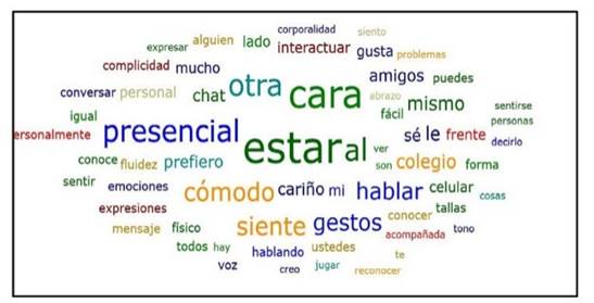 En la Figura 5 se puede observar la nube de palabras que evidencia los aspectos que se repiten con mayor frecuencia dentro de esta categoría, entre ellos: estar, cara, presencial, cómodo, gestos, hablar.