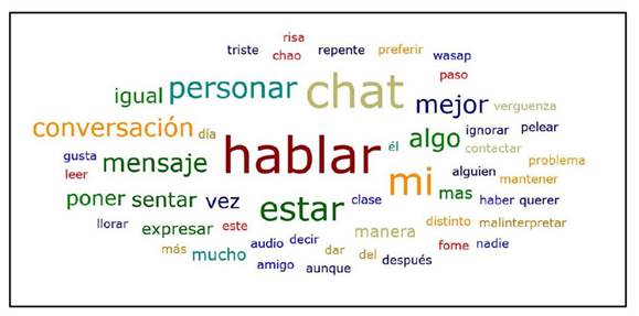 En la Figura 6 se puede observar la nube de palabras que evidencia los aspectos que se repiten con mayor frecuencia dentro de esta categoría, entre ellos: hablar, chat, estar, personal, conversación, mensaje.