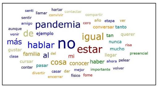 En la Figura 8 se puede observar la nube de palabras que evidencia los aspectos que se repiten con mayor frecuencia dentro de esta categoría, entre ellos: no, estar, igual, pandemia, hablar, familia, conocer.