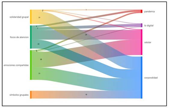 A su vez, los focos de atención en común y las emociones compartidas se relacionan con el celular (su presencia y uso), mientras que las emociones compartidas, los focos de atención y la solidaridad grupal se vinculan con la pandemia. La categoría emergente lo digital se asocia con los focos de atención en común. En contraste, los símbolos grupales únicamente guardan relación con la corporalidad y no presentan coocurrencia con otras categorías emergentes.