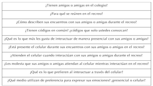 Esta categoría emerge de las preguntas n.º 6, “¿Está presente el celular durante sus encuentros con sus amigos o amigas en el recreo? ”, n.º 7, “¿Atienden el celular cuando interactúan con sus amigos o amigas durante el recreo? ”, y n.º 8, “¿Les molesta que sus amigos o amigas atiendan al celular mientras interactúan en el recreo?”.