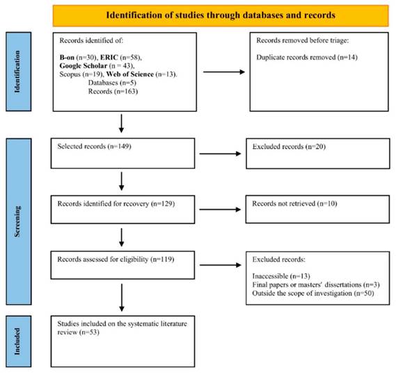 Among these 119 publications, some were excluded because they were inaccessible (n=13), others were final master's or undergraduate dissertations (n=3), and others fell outside the scope of the research upon full-text analysis (n= 50). Consequently, the final research corpus consisted of 53 studies. This entire process is illustrated in the diagram in Figure 1.
