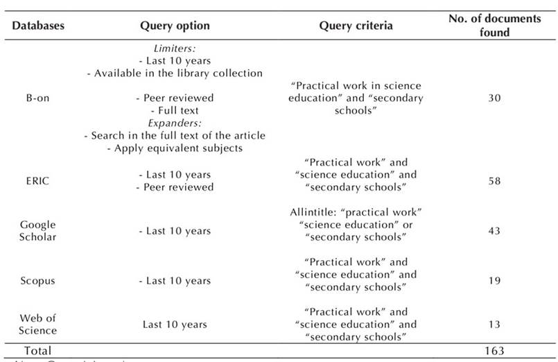 Based on the research question, the following keywords were selected: practical work, science education, and secondary schools. Combining these keywords with Boolean operators allowed for the creation of search strings to be used in various databases.
