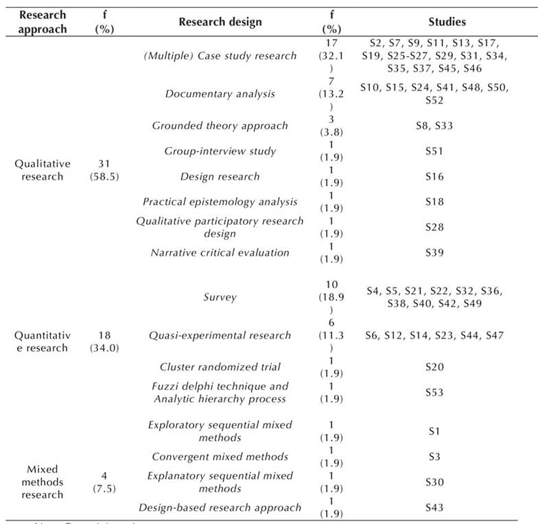 The analysis of the corpus reveals that most of the studies used a qualitative research approach (n=31; 58.5%), followed by quantitative studies (n=18; 34.0%), and finally, studies that adopted a mixed-method approach (n=4; 7.5%) (see Table 3).