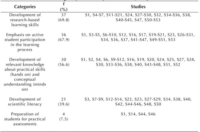 The content analysis of the studies in the corpus identified five overarching categories of advantages associated with the promotion of practical work (Table 4).