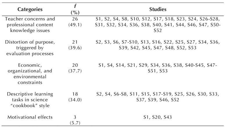 The content analysis of the studies identified five broad categories of disadvantages associated with the promotion of practical work (see Table 5).